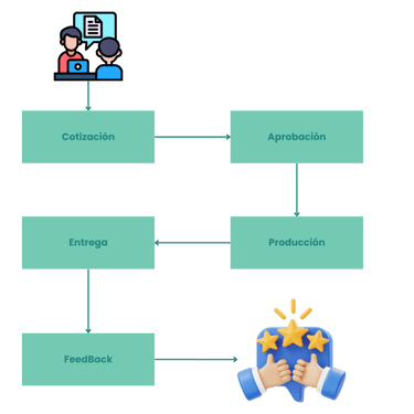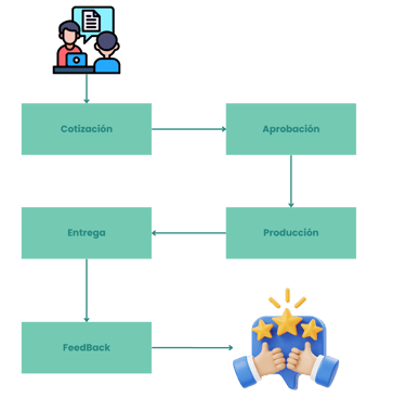 Cada caja representa una tarea o decisión, y cada flecha el flujo de información o materiales.